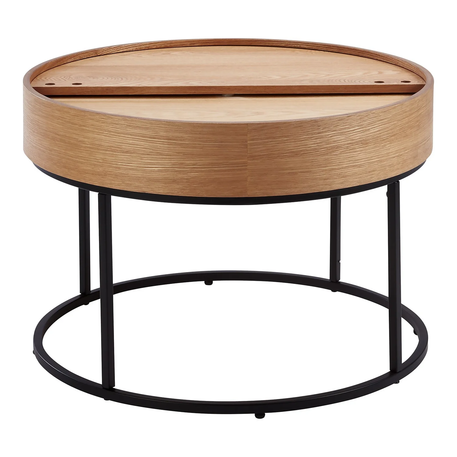 The Halo natural ash coffee table has a hidden storage space in the table top and an elegant black metal base.