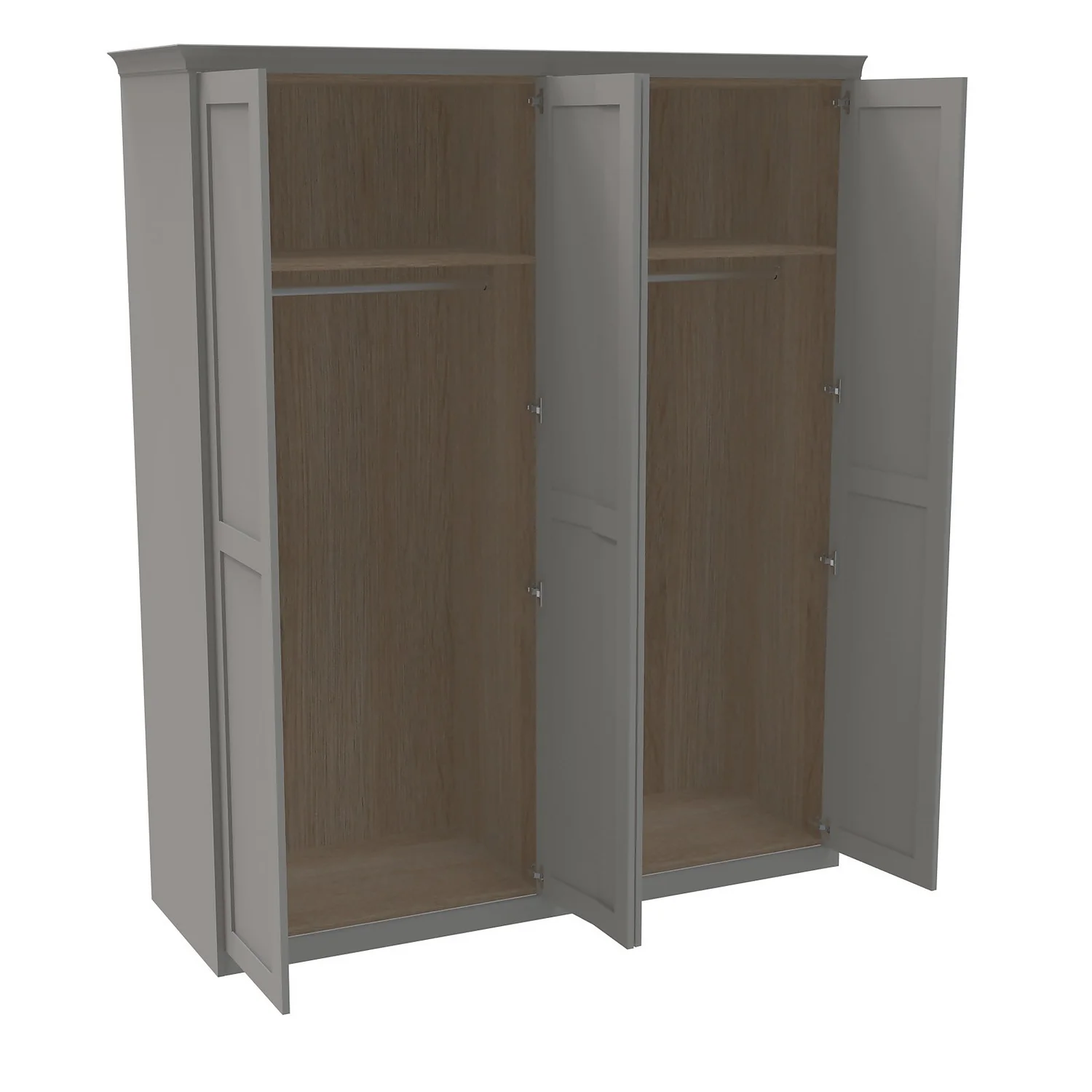 This four door wardrobe (2 x double units) features an oak effect internal carcass and includes end panels, plinth and matching cornice all in a finish to match the beautiful luxe matt grey shaker doors. The wardrobe features premium soft close clip-on Blum hinges, two shelves and two hanging rails. You can customise your wardrobe with our additional internal storage options (available separately) including internal drawers, shelves, dividing shelves and extra hanging rails. Choose your handles from our range of both traditional and modern to suit your desired look.