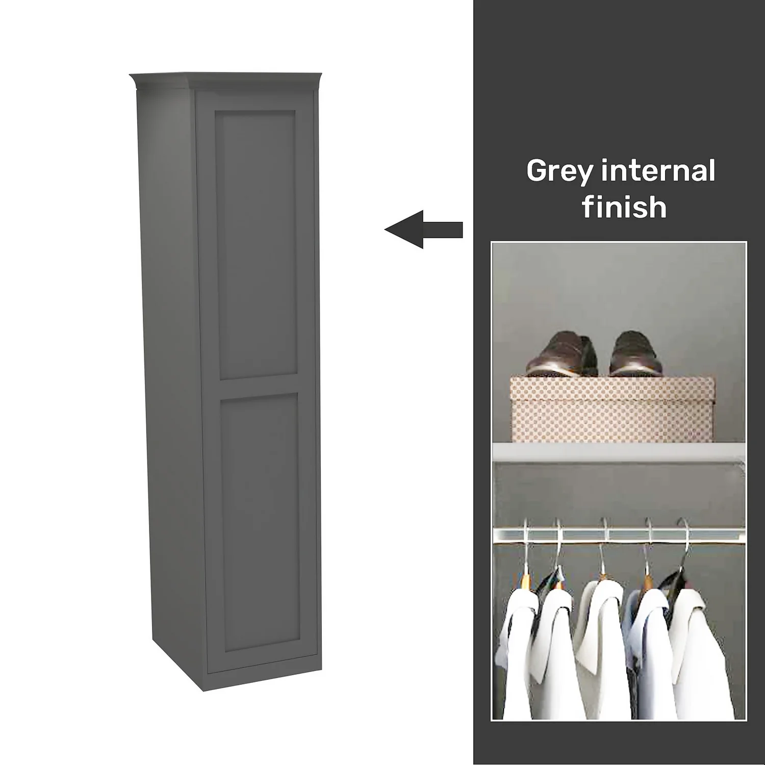 - A fitted look is achieved by using clad on panels, plinth and cornice which are all included with this wardrobe. All the elements that clad the internal grey carcass (clad on panels, plinth and cornice) are a perfect match to the matt carbon grey shaker door