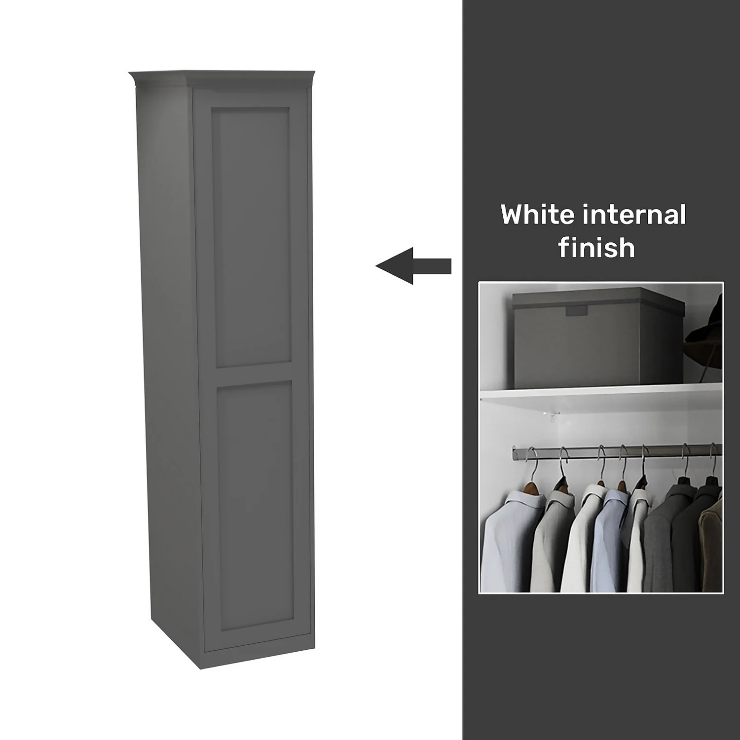 - A fitted look is achieved by using clad on panels, plinth and cornice which are all included with this wardrobe. All the elements that clad the internal white carcass (clad on panels, plinth and cornice) are a perfect match to the matt carbon grey shaker door